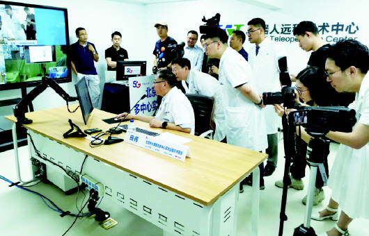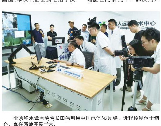 北京积水潭医院院长田伟利用中国电信5G网络,远程控制位于烟台、嘉兴两地开展手术。