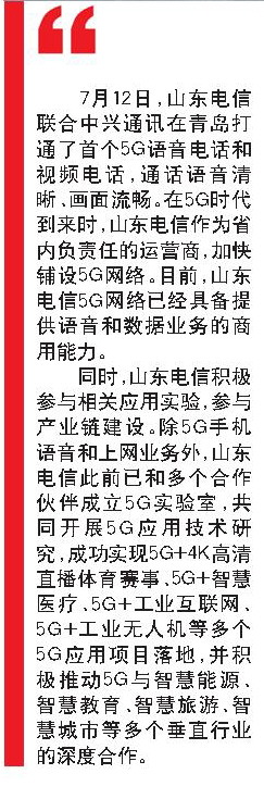 7月12日,山东电信联合中兴通讯在青岛打通了首个5G语音电话和视频电话,通话语音清晰、画面流畅。在5G时代到来时,山东电信作为省内负责任的运营商,加快铺设5G网络。目前,山东电信5G网络已经具备提供语音和数据业务的商用能力。
