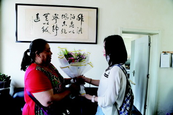 女孩为阿姨献上鲜花表示感谢。