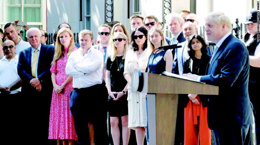 约翰逊当选首相后首次在唐宁街10号发表演说,他的女友西蒙兹(左二穿红裙者)陪伴在一旁。