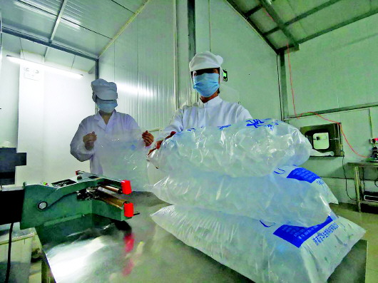 记者注意到,制作冰袋的车间里除了放置着几台机器外,还有一个巨大的桶,周先生告诉记者,这里面装的就是冰袋里放的蓄冷剂。“蓄冷剂通过机器进行包装,工人进行包装好冰袋的整理工作。”周先生说,像这样250克一袋的冰袋,一天就能生产四五万袋。盛放蓄冷剂的大桶桶内冷桶外热,外壁已经因此产生了一层浅浅的水珠。记者从桶里取出一些蓄冷剂,半胶质的物体带着明显的凉意,周先生说,现在蓄冷剂的温度在零摄氏度左右,是无色无味无毒的,所以用手可以直接触碰。“这些冰袋主要的客户就是电商,用于电商行业的生鲜、冰淇淋等产品的运输。”周先生说,每年电商的重大节日,工厂都是24小时轮轴转,才能供应上电商的需求量。