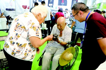 老两口的视力和听力都还不错,但腿脚不是很方便。范先生走路时自己推着轮椅,累了就坐在轮椅上。张女士走路时推着一辆可以坐的小推车,偶尔也会坐一下。范先生想买一把新的紫砂壶,走到紫砂壶展区,挨着看了起来。“在家天天喝日照绿茶,壶也有不少,这次想看看,计划买把紫砂壶。”他说。