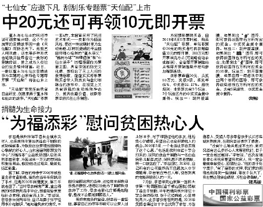 “七仙女”应邀下凡 刮刮乐专题票“天仙配”上市 中20元还可再领10元即开票   董永与七仙女的民间传说可谓家喻户晓,这个千古流芳的爱情故事因一曲《天仙配》而扬名天下。无数艺人用戏曲、话本等多种形式去延续并诠释着这一美好的爱情传说,使之成为人类社会的宝贵精神财富。近日,一款以董永与七仙女爱情故事为主题的山东特色专题即开票“天仙配”将在山东上市。   “天仙配”刮刮乐由我省自主研发,创意来源于董永和七仙女的故事,“天仙配”彩票一套4枚,主画面采用了民间艺术形式——皮影作为插画风格,使这一传统题材更为生动有趣。以特别邀请的专业插画师精心绘制的“董永事父”“槐树为媒”“织縑偿债”和“七仙女送子”四幅插画作为票面主图,具有很强的历史文化感,表现出了天上人间的爱情悲歌,虚虚实实将彩票购买者带入到真实与虚幻相融合的故事中,在视觉上又具有很强的生动性和冲击力,兼具收藏价值,该款彩票目前仅在山东销售。   为回馈彩票购买者,自2019年8月5日零时起,购买“天仙配”彩票,单张彩票中20元的购买者可再获赠面值10元的即开票,200万元即开票送完为止(可能略有结余或超送),全省即开票销售站点和即开票销售展示柜均参加赠票活动。   该彩票面值20元,头奖50万元,奖级9级,返奖率65%,中奖面35.17%。游戏规则:本彩票共有3个玩法,3个玩法区内的中奖奖金兼中兼得。玩法一:刮开覆盖膜,如果刮出“ ”图符,即可获得该图符右方所对应的奖金。中奖奖金兼中兼得。玩法二:刮开覆盖膜,如果刮出“ ”图符,即可获得该图符右方所对应的奖金;如果刮出“ ”图符,即可获得该图符右方所对应奖金的10倍。玩法三:刮开覆盖膜,如果在同一局游戏中刮出两个相同的图符,即可获得该局游戏右方所对应的奖金。共有5局游戏,中奖奖金兼中兼得。   (刘畅) 捐髓为生命接力 “为福添彩”慰问贫困热心人   李岩是滨州市邹平县长山镇东关村人,也是滨州市第15例造血干细胞的成功捐献者。为鼓励这位家境贫困却热心奉献的好心人,山东省福利彩票发行中心“为福添彩”公益救助团队日前来到李岩家中,为其送来一万元的慰问金和生活用品,鼓励他迈过难关,继续弘扬正能量。   据了解,李岩的母亲于2006年被检查出患有直肠癌,虽然在当年年底就动了手术,但是2010年病情复发,第二年就去世了。“当时母亲病情严重,查出得病的时候我刚高中毕业,想着能给家里贴补点家用,就没有再上学。”李岩说,在母亲生病两年后,自己与妻子张宁经同事介绍相识,“她知道我家的情况,不但没有顾虑我的条件,还经常来帮我母亲洗衣做饭。结婚以后她为了照顾我母亲辞了工作,母亲去做化疗都是她陪着,整夜不合眼地照顾老人。”   虽然家庭条件窘迫,但李岩一直坚信,靠着自己的双手早晚可以让家人过上好日子,对于帮助过他的亲友,他始终心怀感恩,希望自己也有帮助他人的机会。2016年3月,一个电话让李岩实现了这个心愿。“电话是滨州市红十字会打来的,说我的造血干细胞与一名白血病患儿配型成功,问我愿不愿意捐献,我一口就答应了。”李岩回忆,2010年,自己所在的公司组织员工自愿加入中华骨髓库,李岩响应号召入库,没想到真的有能帮助别人的一天。   7月份,李岩来到山东第一医科大学第一附属医院(省千佛山医院)捐献了造血干细胞,半年后他向滨州市红十字会询问得知,孩子已经病愈,心里特别高兴。让李岩没有想到的是,2018年受捐者通过红十字会找到了李岩,为答谢恩人,受捐人母亲带着孩子从江苏盐城来到滨州,当面向李岩表示了感谢。   “没有什么难关是过不去的,更何况还有这么多好心人来帮助我们,日子一定会越过越好。”李岩说,“这次省福彩中心来我家看望我和家人,我一定会继续奉献爱心,回馈社会。”他的妻子张宁表示,“有了福彩的支持,我们家的困境也能得到一些缓解,等孩子长大了,我也要让他学会感恩,为社会做奉献。”   (逯禹涵)   省、市福彩中心为李岩(右一)送上慰问金。