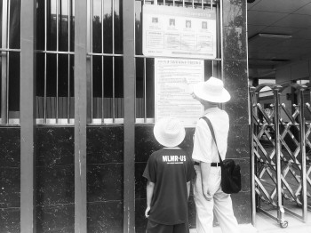 ◥祖孙俩在霍家街小学总校门口,查看张贴的招生简章。齐鲁晚报·齐鲁壹点记者 褚思雨 摄