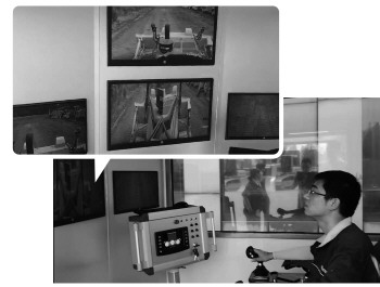 工作人员在操控室内远程驾驶推土机。