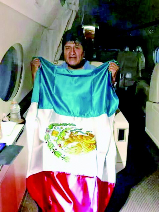 莫拉莱斯上月赴墨西哥避难途中,在墨军方派出的专机内手持墨西哥国旗感谢墨西哥政府施以援手。