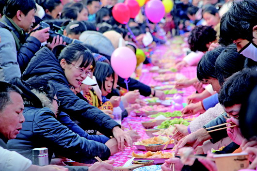 1月1日,初光先照·2020中国(日照)元旦迎日祈福大典暨“好客山东 多彩日照”贺年会在日照万平口旅游区演艺广场举行。作为贺年会的一部分,日照东夷小镇大戏台北侧,摆起了32米长的长桌饺子宴。 齐鲁晚报·齐鲁壹点记者 刘涛 摄