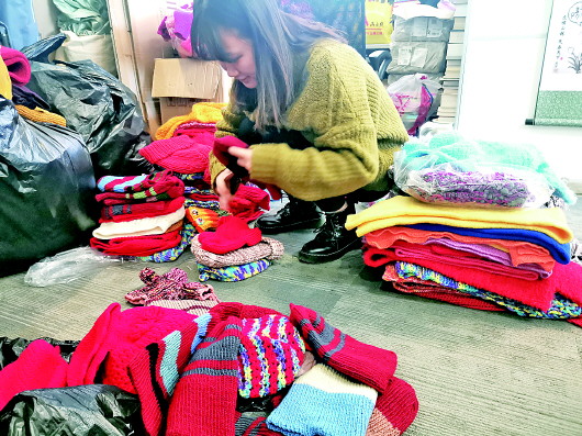 工作人员正在整理爱心针织品。 齐鲁晚报·齐鲁壹点记者 王倩 摄