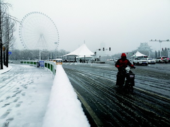 一位市民小心翼翼地从街头驶过。 本报记者 蔚晓贤 摄
