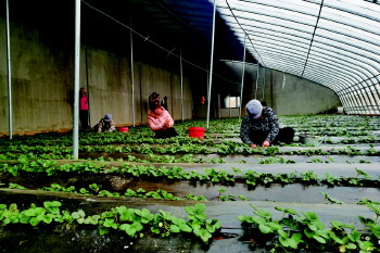 隆冬时节,潍坊临朐县伏峪蚂蚱养殖扶贫基地的草莓大棚里春意盎然,这是利用蚂蚱粪便培育的新品种“红颜”,预计头茬将在春节前上市。图为该村脱贫继续享受政策人员正在对草莓进行疏花疏果管理。