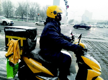 大雪未能阻挡外卖小哥送餐的脚步。