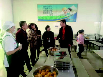 舌尖上的安全 为保证师生舌尖上的安全,威海市温泉学校定期邀约学校食堂食品安全义务监管员对学校食堂的各供货商进行全面检查。(刘新伟)