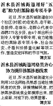 沂水县沂城街道用好“五老”助力扫黑除恶专项斗争 近日,沂水县沂城街道在93个社区(村居)的老党员、老干部、老教师、老组长、老群众代表中选聘279名乡贤,由4个派出所分别专人专管专职专用,有力地推动扫黑除恶专项斗争、社会治安、矛盾纠纷排查化解等项工作,营造安定祥和的节日气氛。 谭庆军 沂水县沂城街道网格员齐心协力摸排涉黑涉恶线索 近日,沂水县沂城街道充分利用162名网格员熟悉当地社情民意的优势,详摸情解民意,把涉黑涉恶线索全部摸排出来,摆上桌面,对症下药,效果显著。 谭庆军