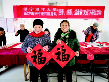 本报济宁1月16日讯(通讯员 张娟 记者 贾凌煜) 14日上午,嘉祥县纸坊镇乡村振兴服务队联合济宁老年大学4位特聘书法教师在纸东村村委会开展以“迎新、纳福、送春联”文化下基层为主题的新时代文明实践活动,为村民送上节日的祝福。