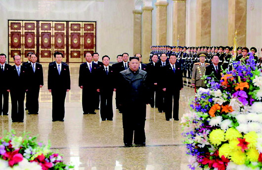 据朝鲜媒体16日报道,金正恩近日同朝鲜劳动党中央领导机构成员前往安放金正日灵柩的锦绣山太阳宫,向已故领导人的立像献花致敬。