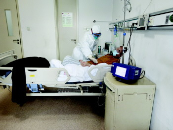 医护人员在隔离病房里照顾病人。