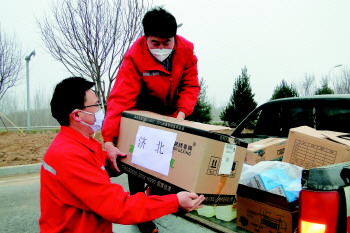 滨南采油管理区副经理孙哲说,因为疫情防控需要,车辆不能跨区域通行,自接到鲁明公司防疫物资“接力跑”的指令后,滨南采油管理区党支部迅速组织骨干力量,提前赶到国道220滨州疫情防控检查站,经过人员体温测量、车辆消毒等流程后,迅速同东营驶来的车队接洽。承担任务的两辆皮卡车,则经过反复消毒、人员体温测量,往返在这400米的路卡之间。