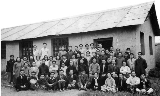 ▲ 1946年西南联大中文系师生合影。二排左起:浦江清、朱自清、冯友兰、闻一多、唐兰、游国恩、罗庸、许骏斋、余冠英、王力、沈从文