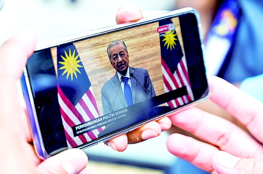 26日,在马来西亚吉隆坡的国家王宫外,媒体记者观看过渡总理马哈蒂尔的电视讲话。 新华社发