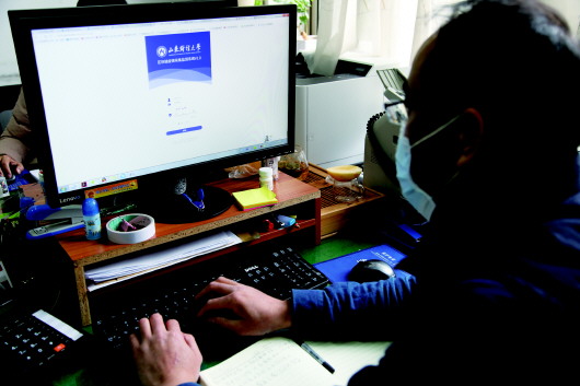 借助疫情采集监测系统,2月26日,山东财经大学的一位老师正进行网上“打卡”。(樊庆臣 摄)