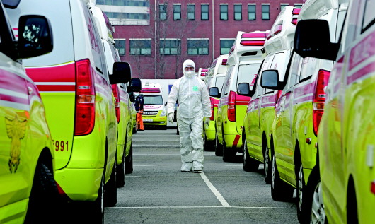 3月1日,在韩国大邱,医务人员在运送新冠肺炎患者的救护车旁做准备工作。 新华/法新