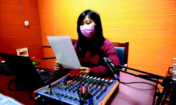 应急广播室工作人员播放疫情防控小知识。