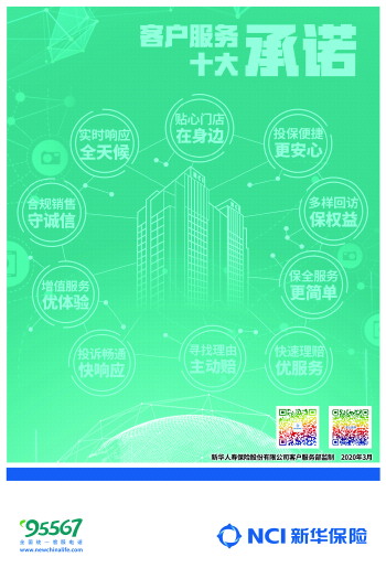 新华保险积极贯彻落实中国银保监会要求,加强金融服务支持,助力疫情防控,正式启动2020年“3·15”消费者权益保护教育宣传周活动。3月5日,新华保险正式发布2020年客户服务十大承诺,突出线上服务,进一步提升服务品质,优化客户体验。