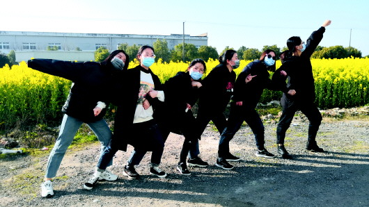 年轻的“口罩援兵”回济南前在口罩厂的油菜花前合影留念。