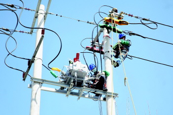 ▲3月18日,国网桓台县供电公司工作人员在10千伏东营线10号杆安装柱上分段开关。(张洪青)