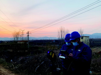 ▲3月25日,国网淄博供电公司博山分中心工作人员在博山镇朱南村对10千伏洪山口线38号杆进行检查,为乡村杏花节园区保电。(孙越)