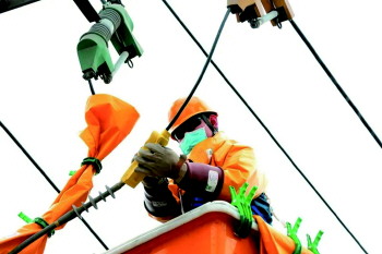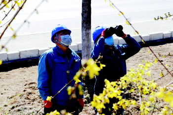▲3月23日,国网淄博供电公司输电运检室工作人员对220千伏辛台Ⅰ、Ⅱ线3号塔瓷制绝缘子喷涂RTV涂料。(金增航)