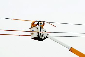 4月2日,国网淄博供电公司博山分中心工作人员在白塔镇10千伏宏桥线34号杆进行线路绝缘遮蔽,完成带电立杆作业。(孙越)