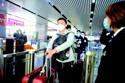 济南站,石河子大学的学生通过专区排队进站。 齐鲁晚报·齐鲁壹点记者 王媛 摄