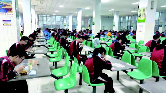 4月14日,在山东省北镇中学,学生在食堂分区就餐,井然有序。