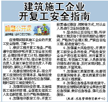 建筑施工企业 开复工安全指南   疫情期间建筑施工企业的开复工安全指南,了解一下!   1、做好工程开复工准备。严格遵守疫情防护和开复工安全有关规定,合理安排开复工计划。提前做好务工人员使用计划。建设单位项目负责人及施工单位项目负责人不能到岗的,原则上不得开复工。   2、完善疫情防控体系。建立开复工疫情防控管理体系,编制疫情防控工作方案,制定防控应急预案,随时监控工地疫情变化。   3、加强现场防疫管理。实施建筑工地封闭管理,全面落实建筑工人实名制管理,实行严格消毒制度。   4、加强培训教育工作。开复工前要通过微信、视频等方式,对从业人员进行卫生防疫教育。   5、坚决防止盲目抢工期。科学确定工期及每个阶段所需的合理时间,严格执行合理工期,严禁盲目抢工期、赶进度等行为。   6、加强重大风险管控。开展开复工前安全条件检查,严格检查安全生产责任落实情况,并对重要文件落实、专项施工方案、人员教育培训情况进行检查,及时发现问题,及时整改、不留死角。   7、加强施工质量管理。完善项目质量保障体系,落实质量责任制度,保证工程质量。   8、加强应急准备和值班值守。要制定疫情期间质量安全事故处置应急预案,做好应急准备,强化应急演练。   (来源:应急管理部宣教中心)