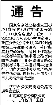 通 告 因京台高速公路泰安至枣庄(鲁苏界)段改扩建工程施工,G3京台高速济宁段K510+750至K575+480(济宁与泰安、枣庄分界处)将于4月30日0时起根据工程进展分段落、分时段实施交通导改,届时上述路段车流将转至新建半幅公路双向四车道通行;部分路段受路况限制将采取三车道或两车道通行。请广大驾驶员朋友严格遵守交通法规,按标线、标牌及引导人员指示谨慎驾驶。 济宁市公安局高速公路交通警察支队 山东高速股份有限公司 二O二O年四月十五日