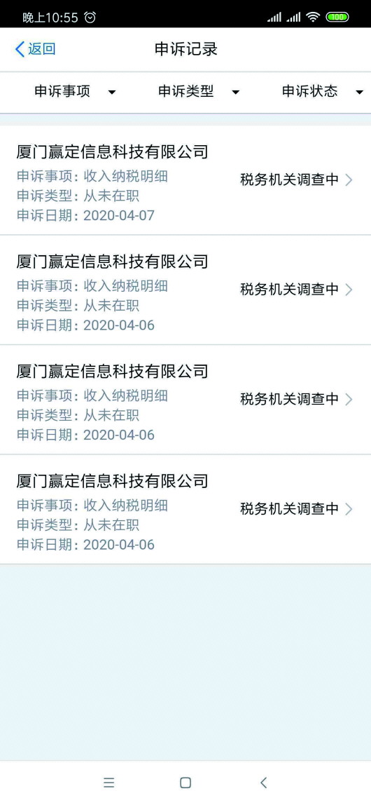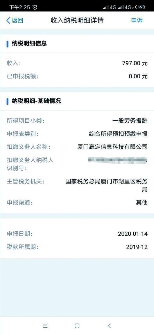 “缴税可能也就是几十块钱的事儿,但公司的行为不能接受,因为我授权(身份信息)给接单宝的平台使用了,结果他们给做到员工账里去了。”马先生说,他在“个人所得税”APP上以“从未在职”的理由申诉后,系统显示税务机关正在调查中。而接着厦门这家公司也联系到他,解释称劳务费“发错了”,发了一笔,但他却反驳称收到了四笔,公司表示将继续处理此事。