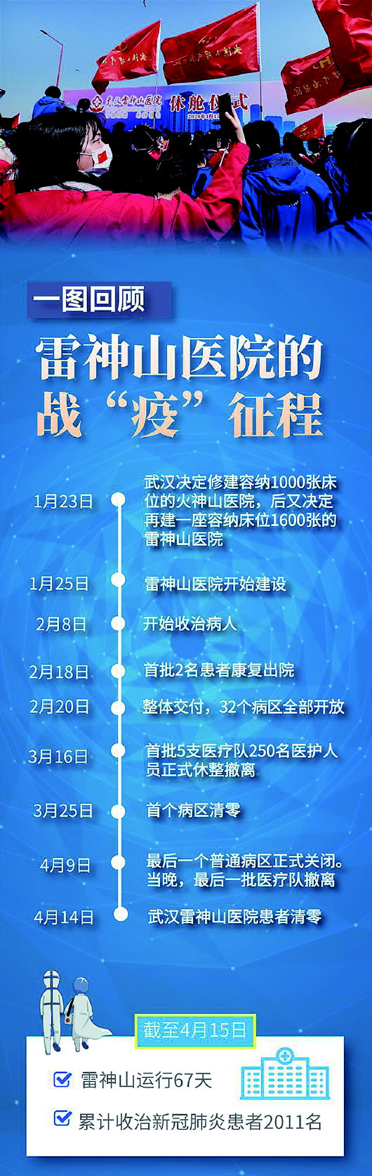 从2月8日接收第一名患者开始,67天时间里,雷神山医院累计收治患者2011人,其中康复出院共计1900余人。投用期间,除了接管单位武汉大学中南医院的466名医护人员外,共有来自全国9省市、16支医疗队、286家医院的3202名医护人员陆续进驻,加上660名后勤人员,总计3862人加入过雷神山医院。武汉大学中南医院院长、武汉雷神山医院院长王行环表示,雷神山医院的封舱和保管工作将由武汉东湖医院接管。