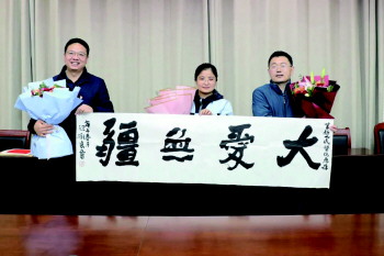 交流会结束后,院领导为三位援鄂医疗队员送上书法艺术家为其创作的书法作品,并合影留念。