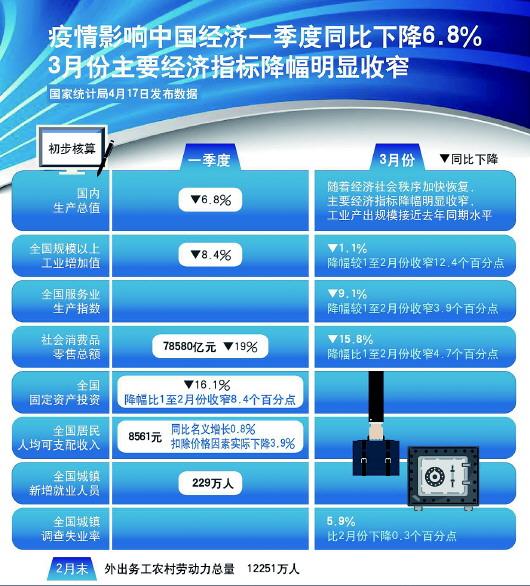 据新华社北京4月17日电 国家统计局17日发布数据,初步核算,一季度国内生产总值同比下降6.8%。3月份,随着经济社会秩序加快恢复,主要经济指标降幅明显收窄,工业产出规模接近去年同期水平。