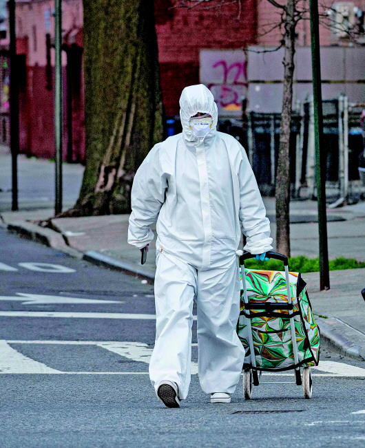 20日,美国纽约街头一名身穿防护服的女子拖着购物车。