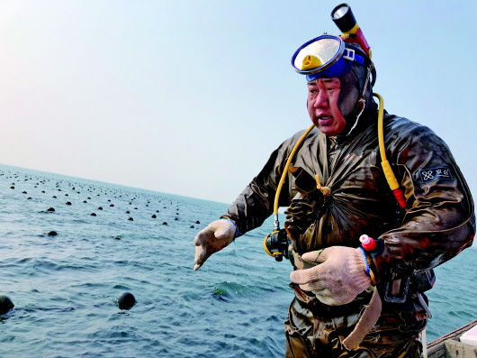 35岁的肖奥是下海捞参的蛙人,他要绑上四五十斤的配重腰带,潜入水下20米深的海域,下去一次要待40分钟到1个多小时,能捞40斤至50斤野生鲜海参。肖奥说,捕捞旺季一天下海约六次,能捞200斤野生海参,约有2000元的收入。高薪的同时也常伴危险和职业病。他说,下完海后特别累,每天回家吃点饭就不想动弹,只想坐着歇一歇。