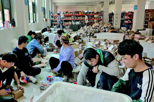 4月28日下午,在临沂临谷孵化园,快递公司两台箱式货车停在阿聪家门口,位于一楼的仓库内,至少22名员工正忙着把产品封装进快递纸箱,此起彼伏的撕扯胶带声甚至盖过了门口货车的发动机噪声。