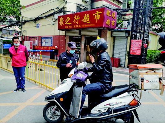 在济南市山大路街道甸柳社区,外卖快递人员经测温登记后可以进出。