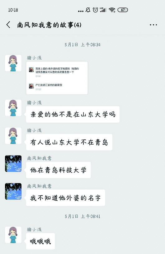 报道发出后,5月9日上午,“猪小浅”公众号小编联系记者,解释了关于学校的问题,“我们在写学校的(时候)没有细问,然后给女主看的时候她也没有看出来写错了。”“南风知我意”则回复说,“他在青岛科技大学。”