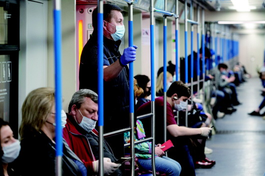 ▲5月12日,在俄罗斯首都莫斯科,人们佩戴口罩和防护手套乘坐地铁。