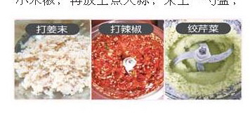 丸子馅:“买了这台机器,自己在家搅,先放肉,再放葱、姜、放一块馒头,撒少许盐,放一勺五香粉,放一勺酱油,盖上盖子,只要7秒钟,这丸子馅就打好了,平时做干炸丸子,汆丸子、四喜丸子,可方便了!”