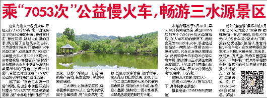 据了解,“秀色三水源一日游”线路,是山东中铁国际旅行社整合“7053次“列车沿线旅游资源,继“中郝峪村两日游”“齐文化一日游”“潭溪山一日游”等线路产品后,新推出的一款休闲旅游线路。