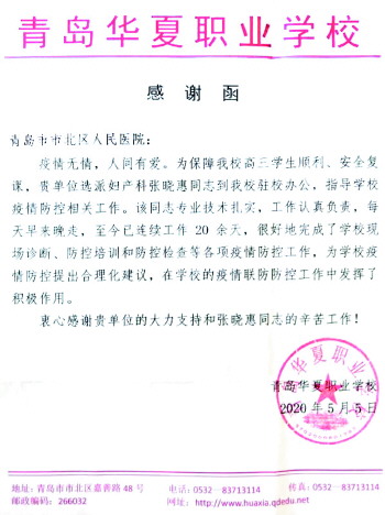 疫情初期,张晓惠便主动申请到该院发热门诊等防控一线工作,进驻学校后,包括五一假期,连续二十多天无休,天天早来晚走坚守在防控岗位。她每天积极配合校医对学生及教职员工进行体温检测,指导学生正确使用口罩、正确洗手七步法,认真检查应急物资准备、留观室配备,培训后勤人员正确使用消毒消毒剂、规范处理防控医疗垃圾,发现异常情况及时处理、及时上报。“疫情无情,人间有爱”,她的辛勤工作得到华夏职业学校的充分认可,特发函市北区人民医院致以衷心感谢。 (贝仁奕)