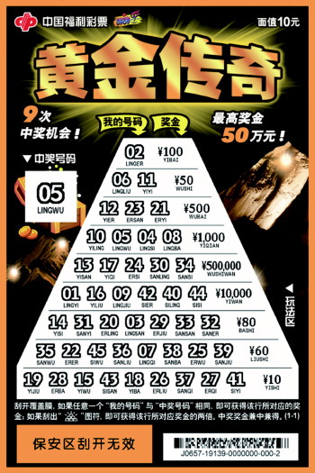 “黄金传奇”彩票面值10元,头奖50万元,奖级10级,返奖率65%,中奖面32.34%。